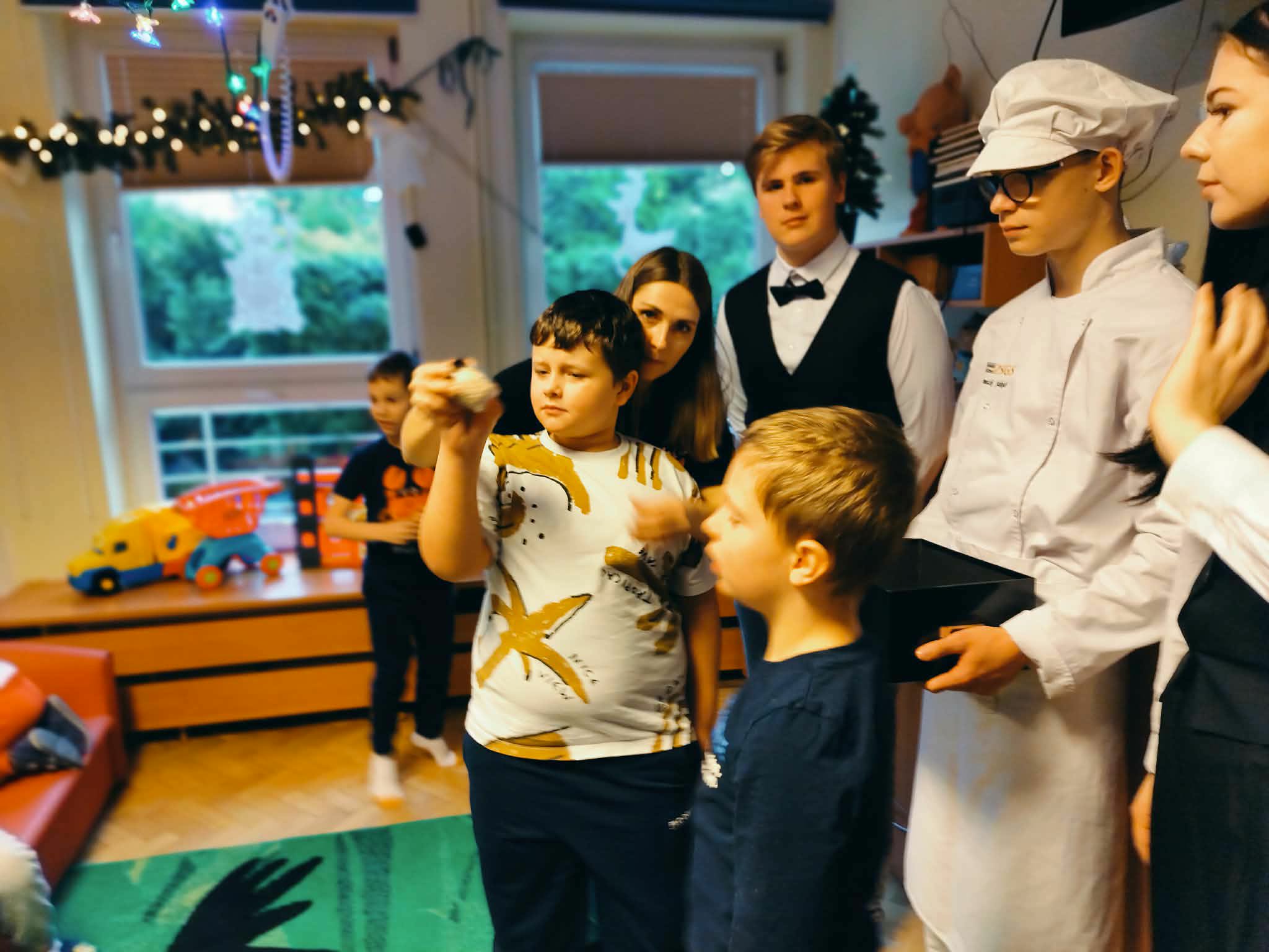 Podczas wizyty nasi reprezentanci przedstawili przedszkolakom specyfikę zawodu kucharza oraz kelnera. Dzieci miały okazję zobaczyć profesjonalne stroje branżowe i dowiedzieć się, jak ważny w tych zawodach jest odpowiedni ubiór. Dużym zainteresowaniem cieszył się quiz wiedzy na temat przyborów kuchennych używanych w profesjonalnej gastronomii. Przedszkolaki wykazały się dużą wiedzą i chętnie brały udział w zabawie.