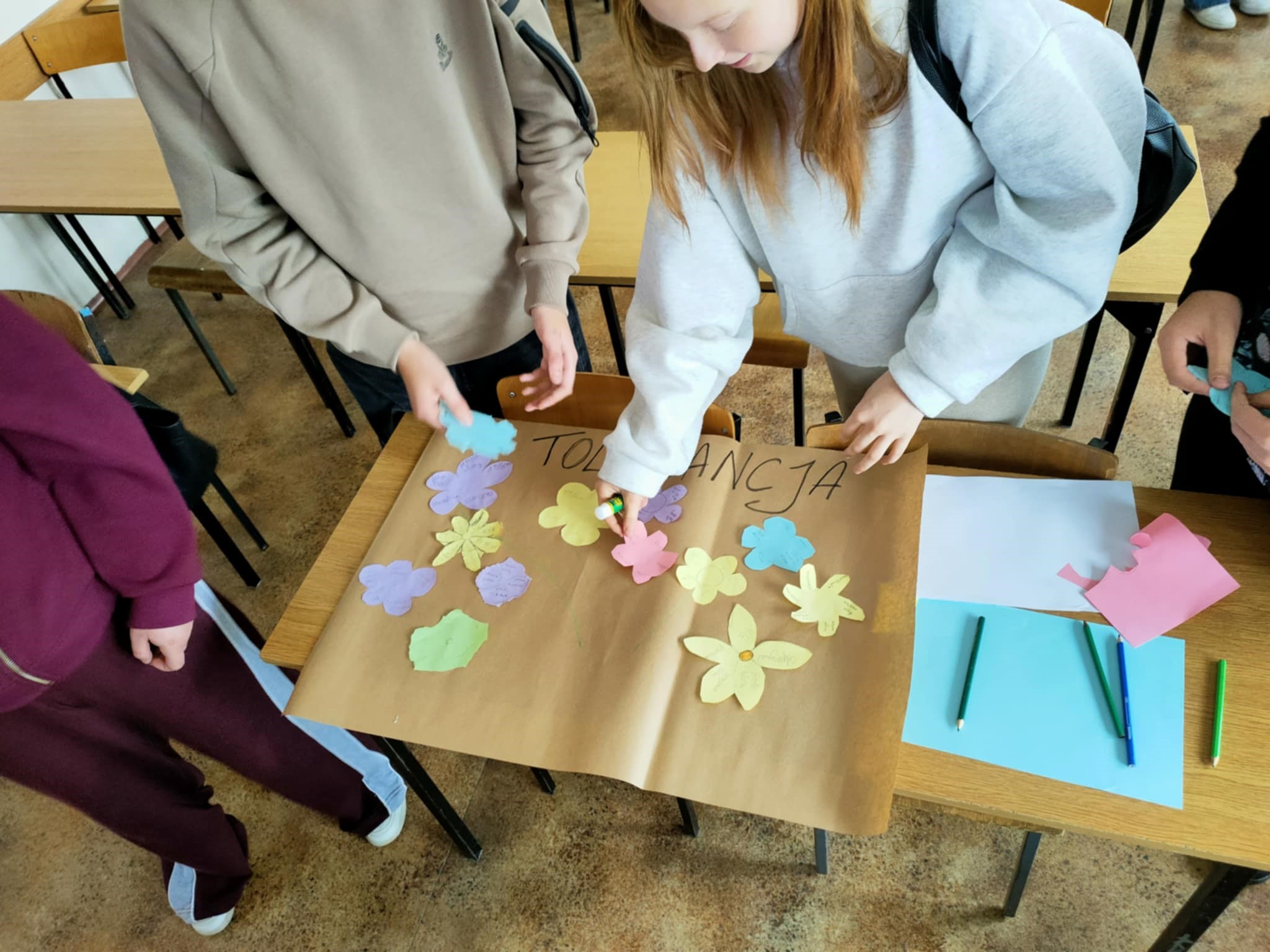 - Uczniowie wykonujący plakaty na temat tolerancji podczas warsztatów z pedagogiem p. Marceliną Lompert