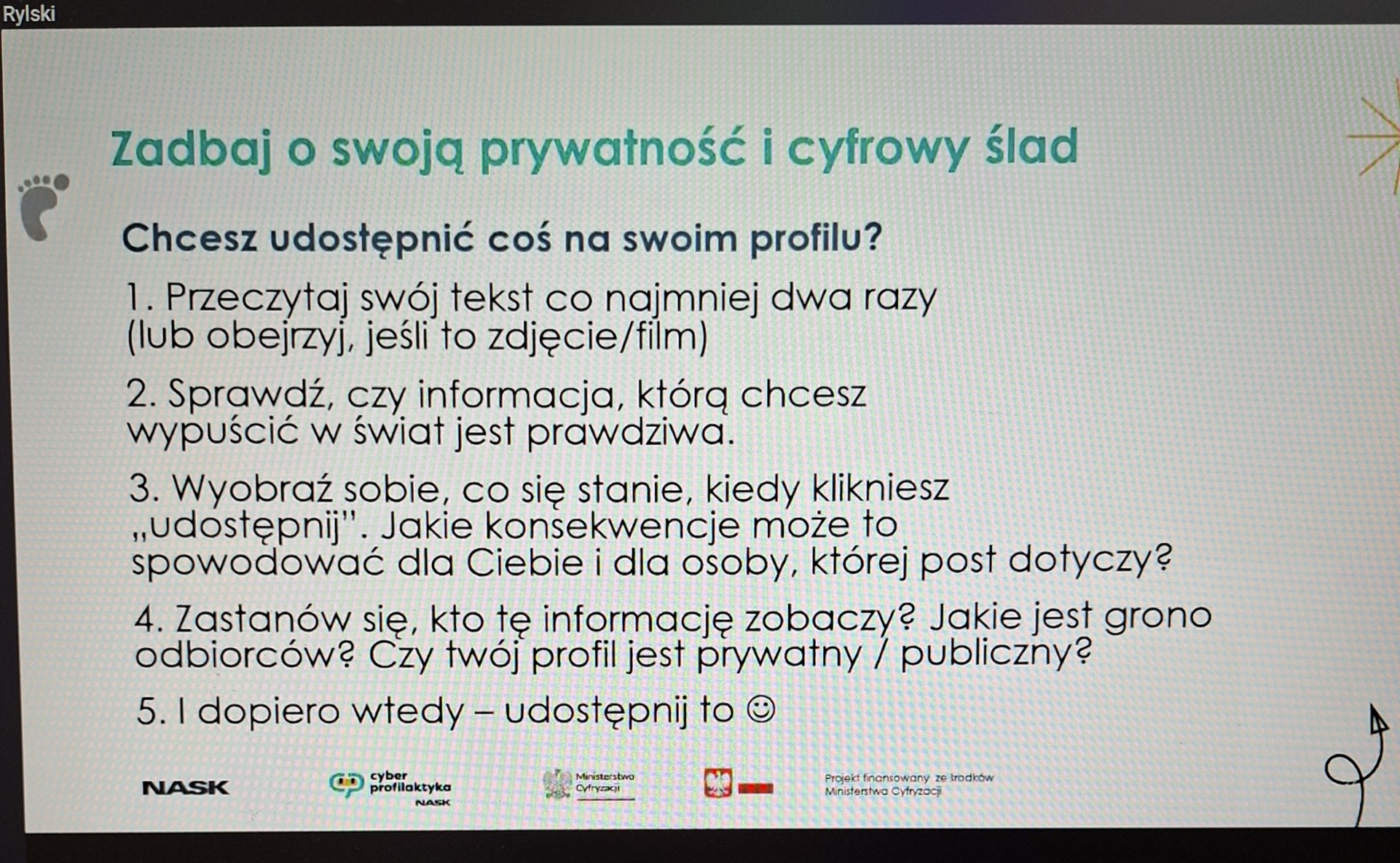 Ważnym wnioskiem płynącym z lekcji było uświadomienie uczniom, że w Internecie nic nie ginie, a prywatność jest wartością, którą należy chronić z dużą rozwagą i odpowiedzialnością.