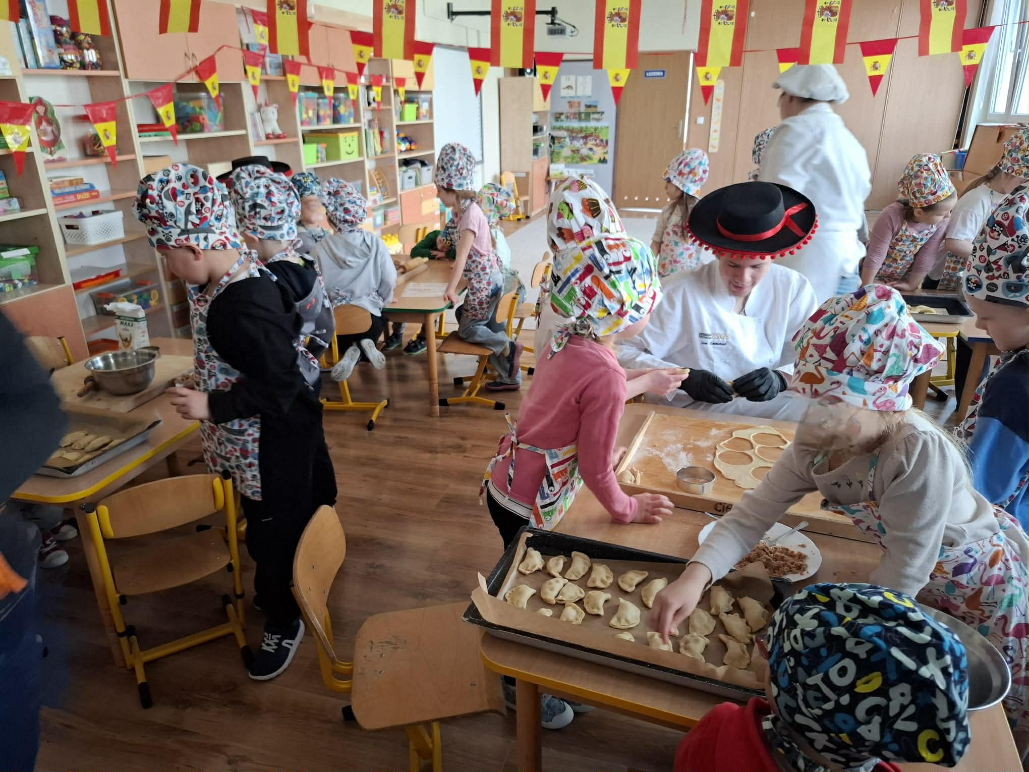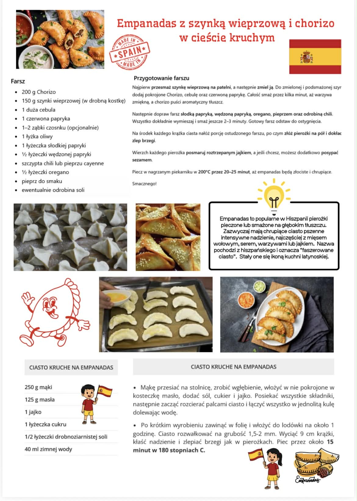Podczas spotkania dzieci miały okazję poznać elementy tradycyjnej kuchni hiszpańskiej, słynącej z bogactwa smaków, aromatycznych przypraw oraz regionalnych specjałów. Głównym punktem warsztatów było przygotowanie empanadas z mięsem wieprzowym i chorizo – popularnych hiszpańskich pierożków o chrupiącym cieście i wyrazistym farszu.