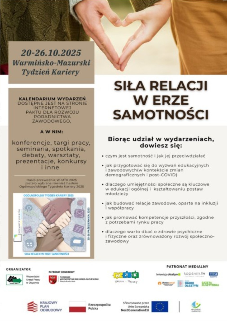W dniach 20–26 października 2025 r. na terenie całego województwa odbył się cykl wydarzeń związanych z Warmińsko-Mazurskim Tygodniem Kariery. Tegoroczna edycja przebiegała pod hasłem „Siła relacji w erze samotności”, zachęcając uczestników do refleksji nad rolą więzi międzyludzkich we współczesnym świecie.