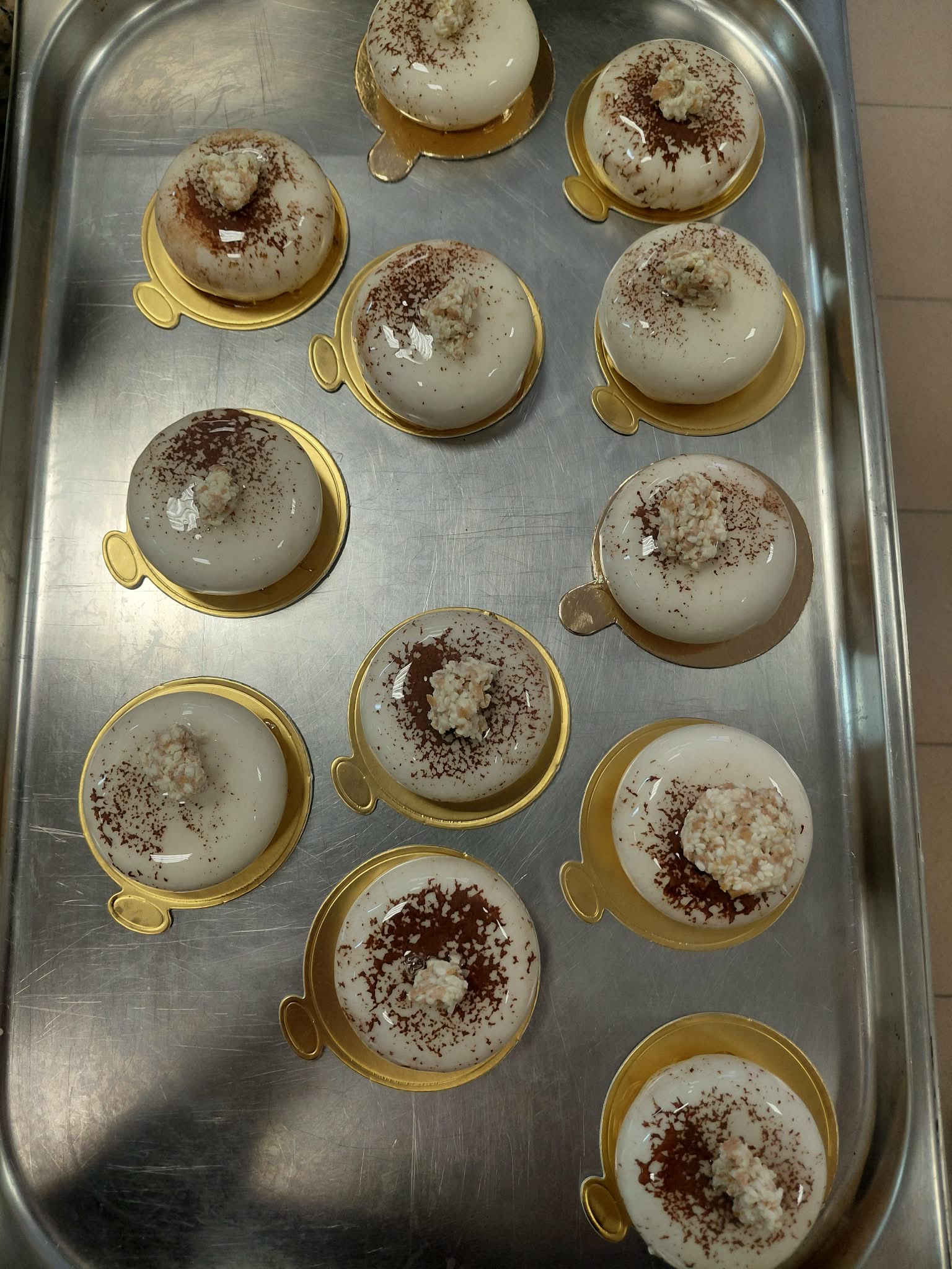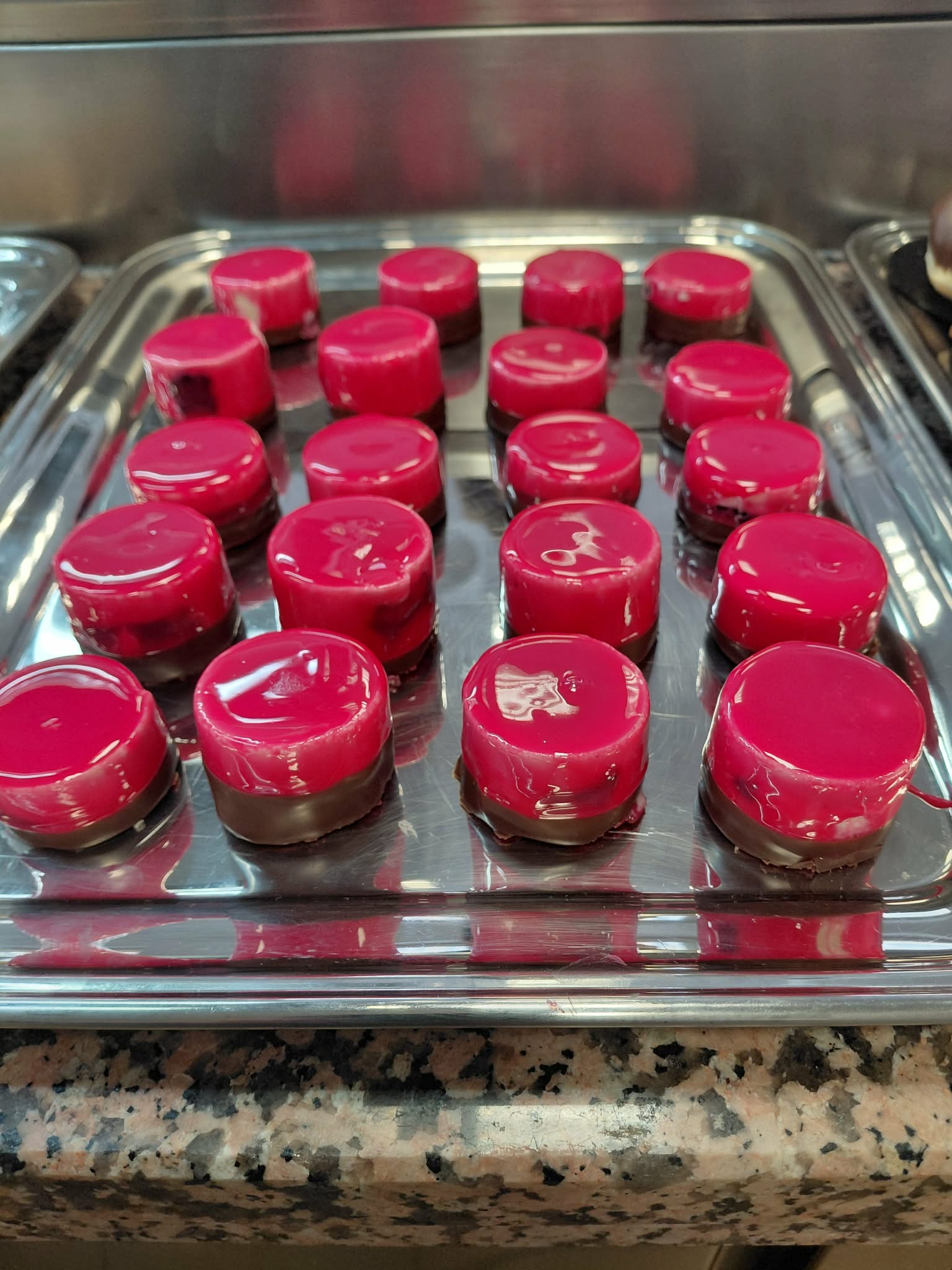 - Monoporcje – daquoise migdał – galaretka z czarnych porzeczek – mus bawarski
