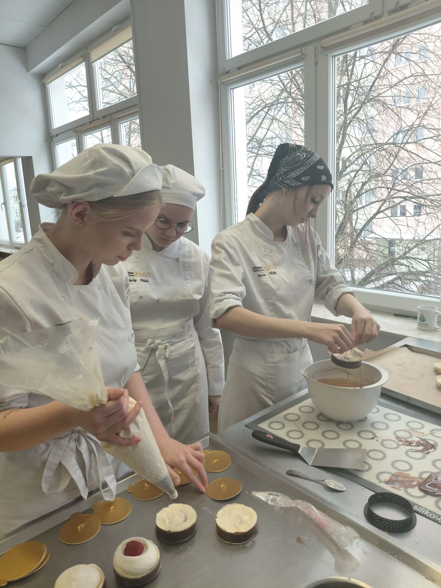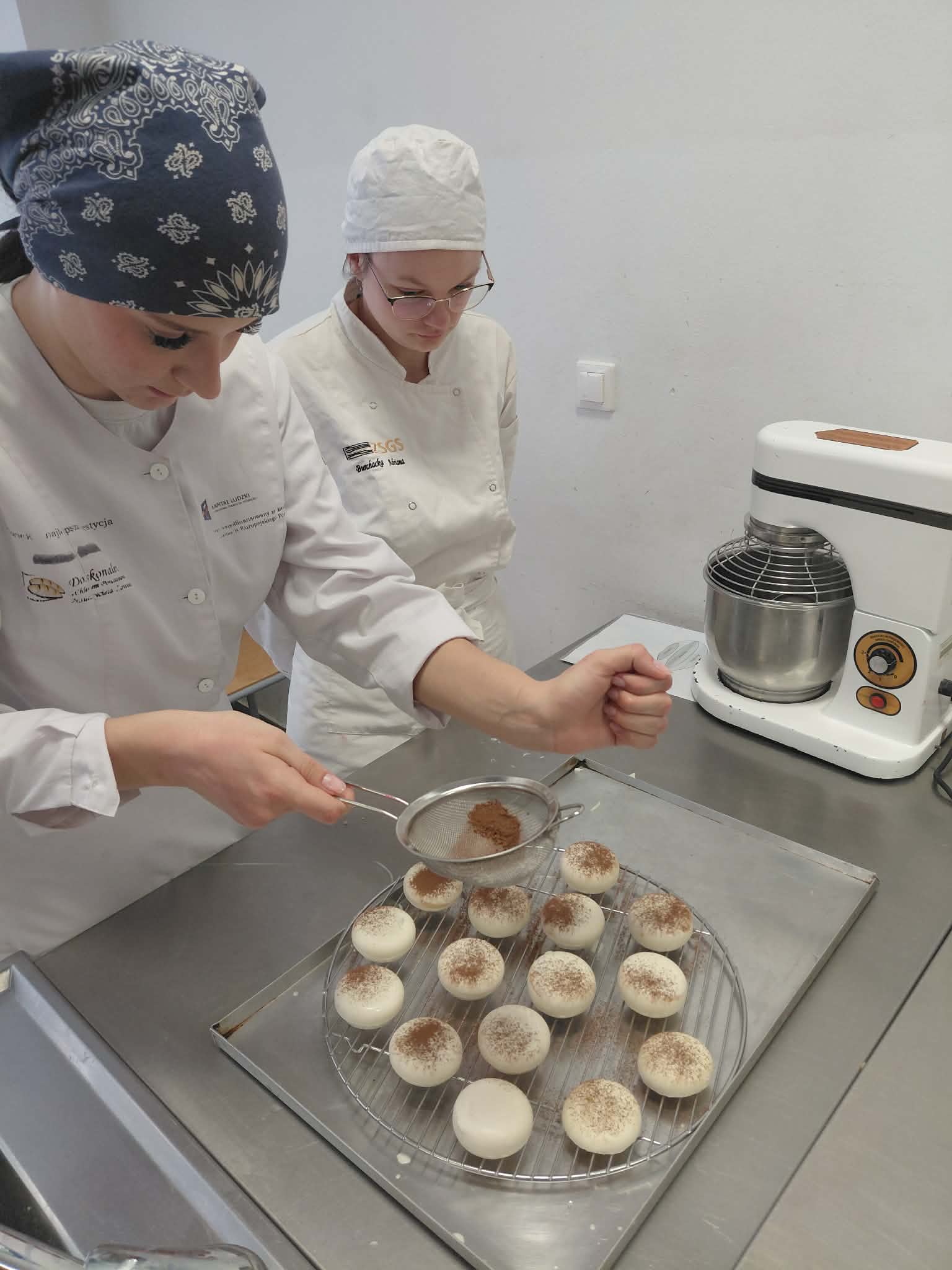 W części praktycznej młodzież poznała różne rodzaje polew cukierniczych oraz techniki ich przygotowania. Uczniowie uczyli się prawidłowego oblewania monoporcji, tak aby uzyskać idealnie gładką i efektowną powierzchnię. Nie zabrakło również wskazówek dotyczących łączenia smaków, estetyki podania oraz nowoczesnych metod dekorowania, które łączą tradycyjne receptury z aktualnymi trendami cukierniczymi.